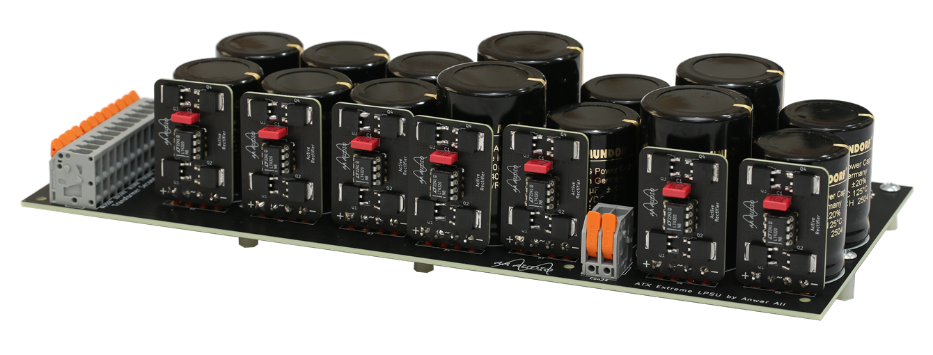 6 rails of low-noise LPSU with active rectifiers and Mundorf MLytic AG smoothing capacitors